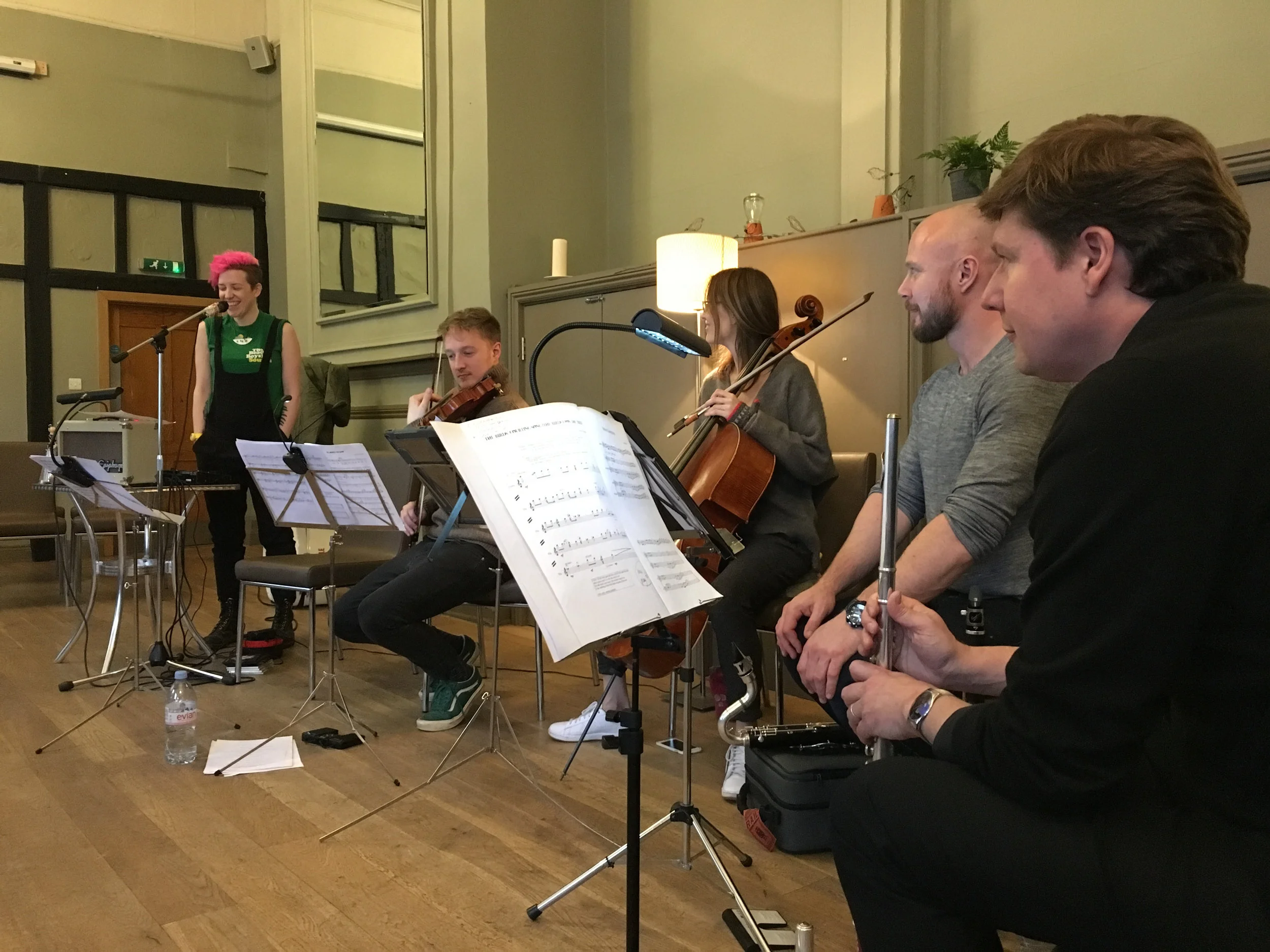 Kerry Andrew, Daniel Pioro, Clare O'Connell, Stuart King & Julian Sperry rehearsing Birdsong at the Kings Arms Berkhamsted