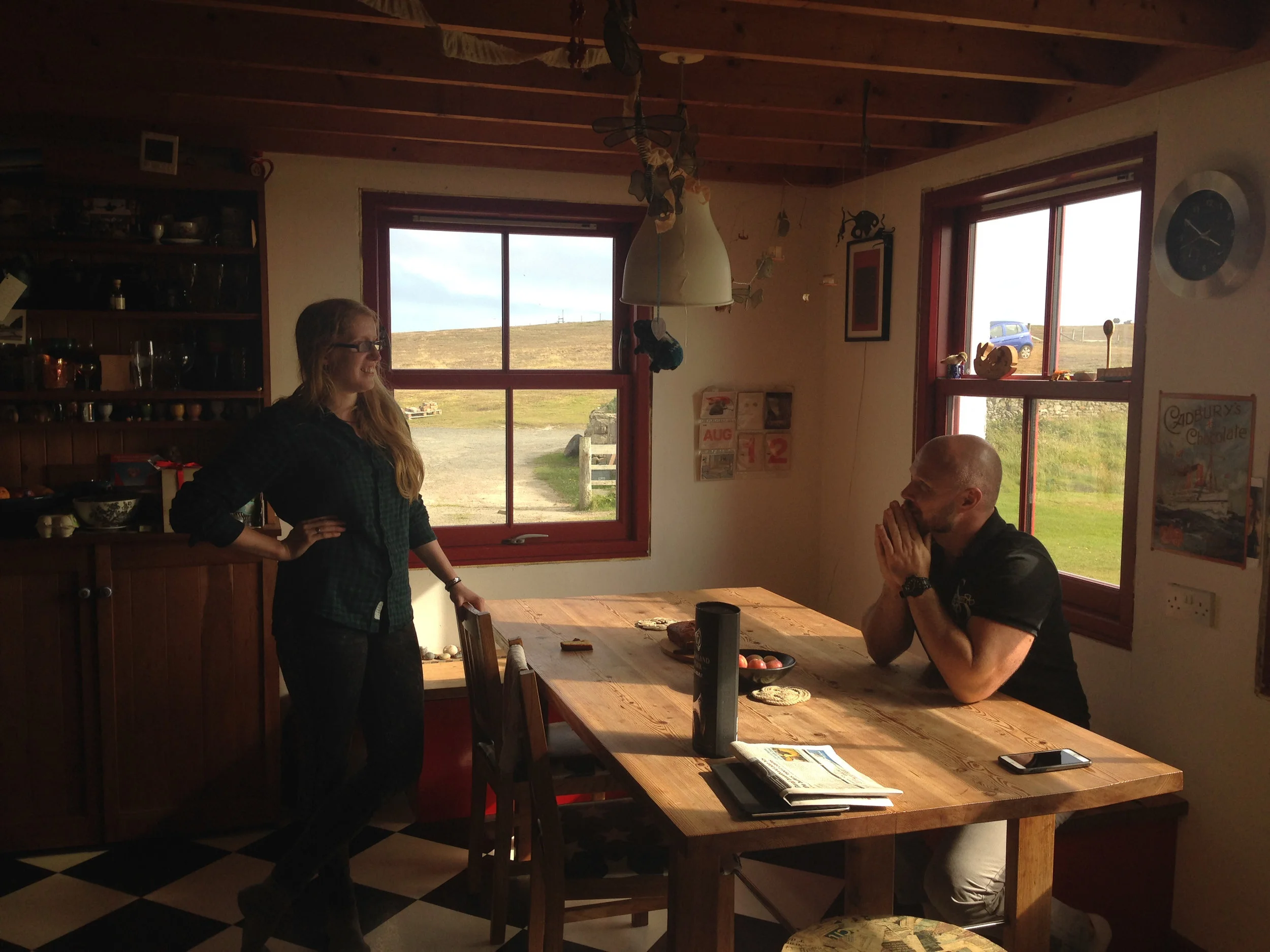 A taxi takes us north to Lerwick (about 45 minutes drive) where we have time for lunch and a catch up with old friends Alice and Lowri Best at the Peerie Cafe. We’ve caught Alice on her way out to her blacksmithing apprenticeship in Norway, whilst Lowri has stepped out to meet us from his lunch break at Anderson High School. We’ve known these two since they were very young, having done several projects with them whilst they were still at Fair Isle Primary School. We had many happy music-making times with their mother Lise Sinclair, who died of a brain tumour in 2013.